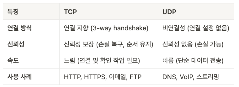 UDP : 속도가 중요한 서비스(스트리밍, 실시간 통신 등)에 적합
