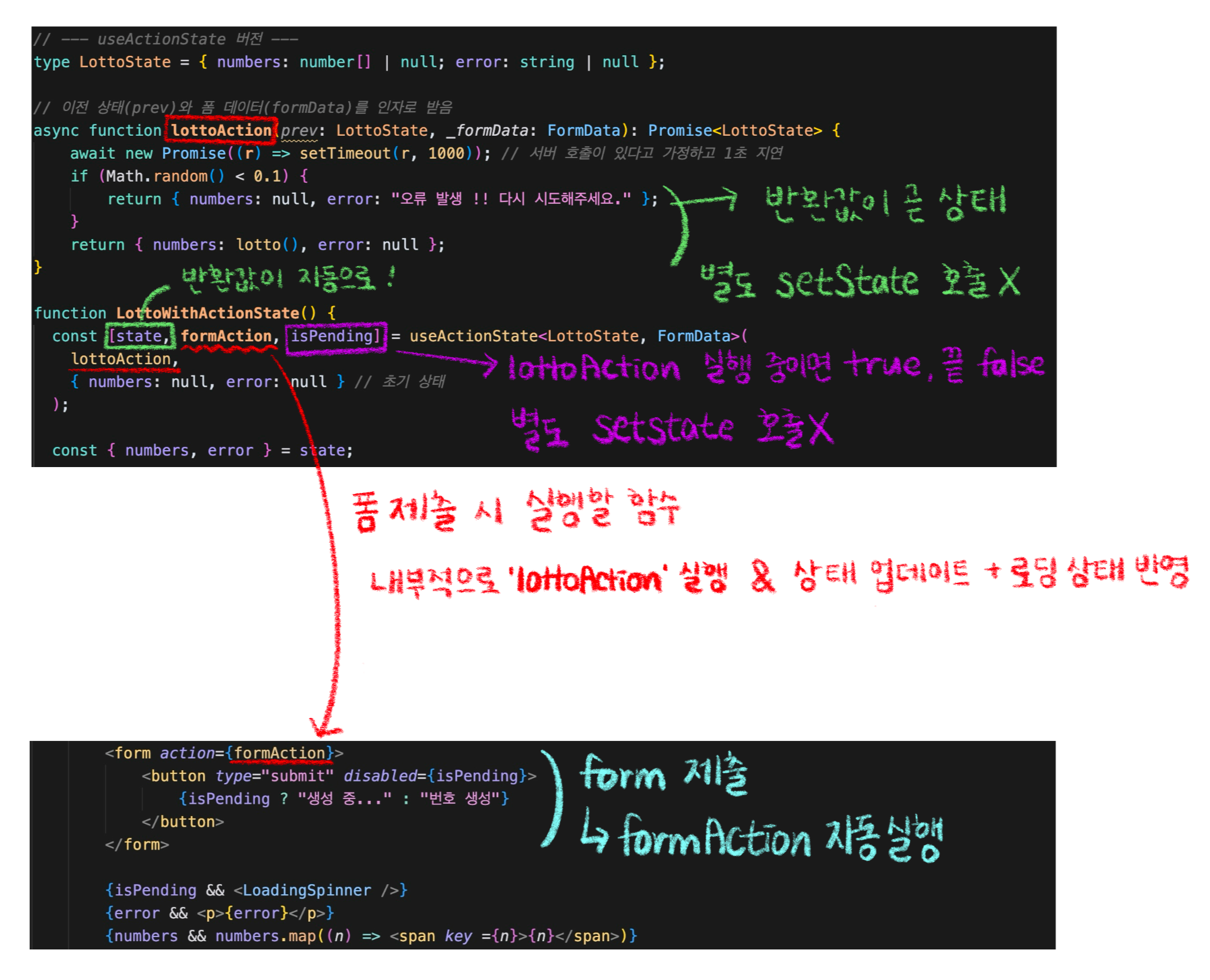 | 결과/에러 반영 | setNumbers, setError 직접 호출 | 액션 반환값 자동 반영 |